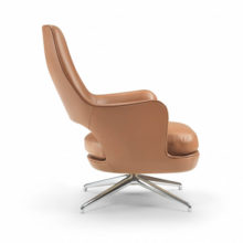 The incredible versatility of the Eliseo armchair is underscored by the option of having a wood base in a number of finishes, or a cast aluminum base, equipped with a 360-degree swivel that lends the armchair a dynamic air and facilitates interaction with the surrounding space.