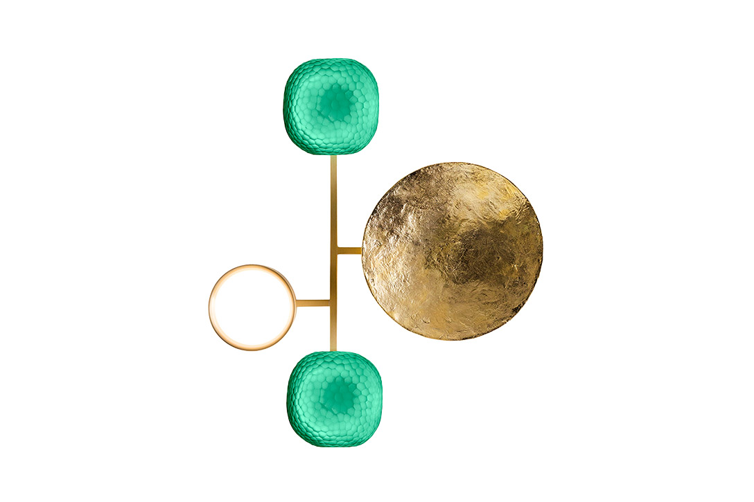 The Gioielli 06 is a statement wall appliqué inspired by the goldsmith’s art — hand-blown Murano glass paired with lost wax brass casting at an impactful scale.