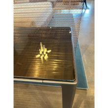 Our floor model of Mirto Console Table by Antonio Citterio is now on sale and ready for pickup at our Denver showroom. In good condition, the 74 3/4″ floor model features a top in painted bronze reflective glass top and a base in pewter-painted metal.