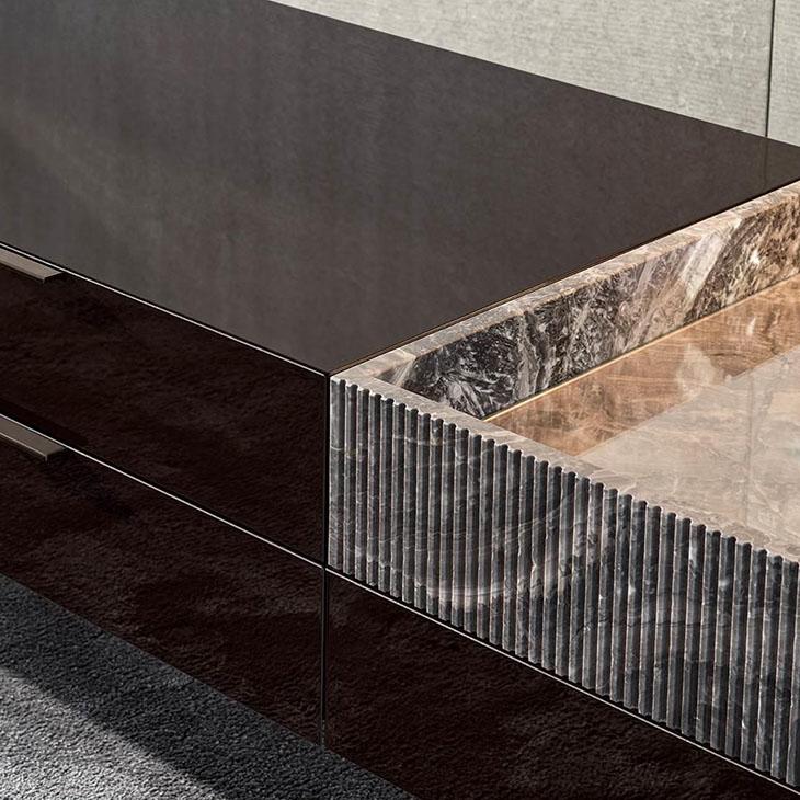Both decorative and functional, Superblocks adapts to diverse environments through various configurations and accessories designed for specific functions. Available in living and dining versions with optional brushed marble elements for object storage, refined black saddle-hide cutlery trays, or an elegant jewelry drawer with screened glass top for bedroom settings. The extreme simplicity of design is elevated by rich detailing, creating a rigorous style that dialogues perfectly with all shapes in the Minotti collection.