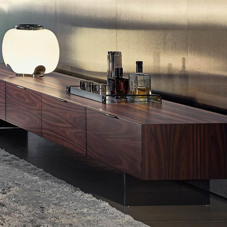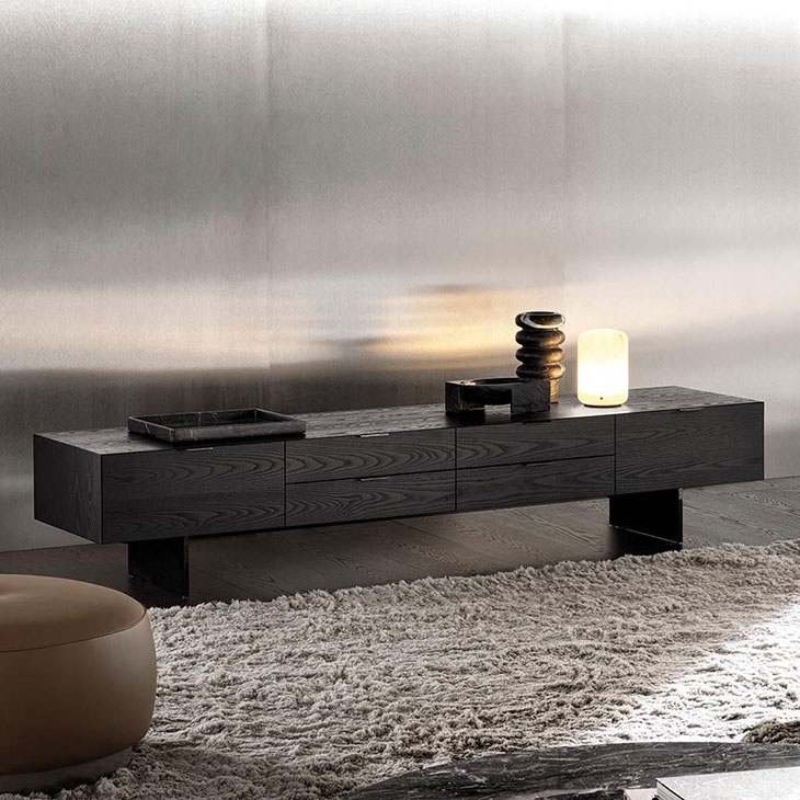 Superblocks Sideboard by Marcio Kogan / Studio MK27 for Minotti draws inspiration from the rationalist approach to lines, shapes, proportions, and materials characteristic of the renowned Brazilian studio’s architectural work. This true piece of architecture features a wood or glossy lacquer storage element resting on elegant polished Brandy metal blades.